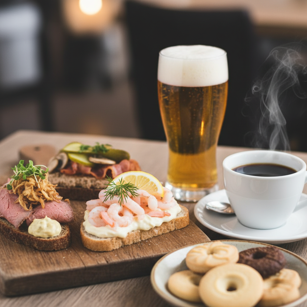 3 stk. smørrebrød, 1 øl/vand, kaffe og småkager.