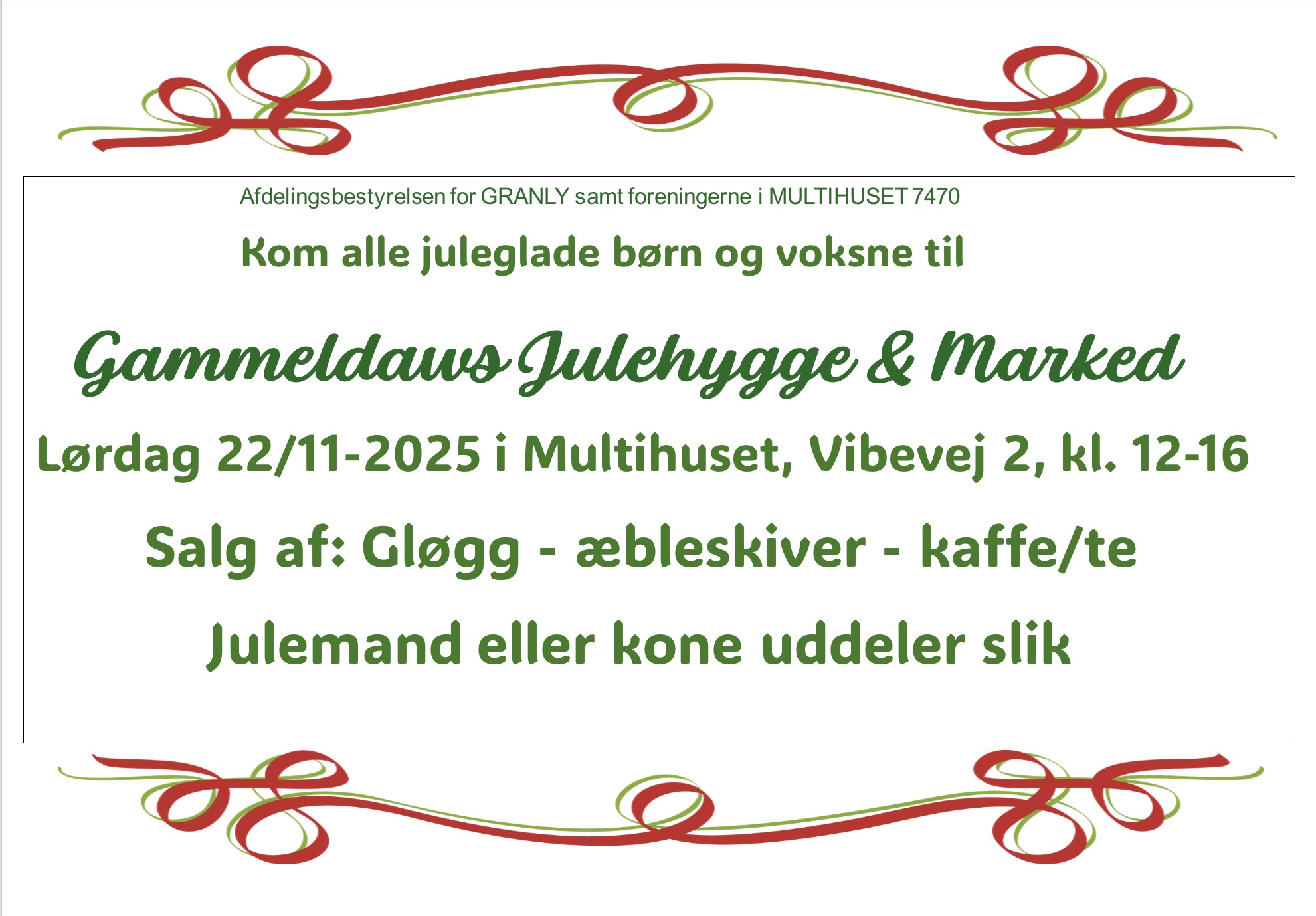 Afdelingsbestyrelsen Granly afholder sammen med foreningerne i Multihuset 7470, Gammeldaws Julehygge samt Marked.